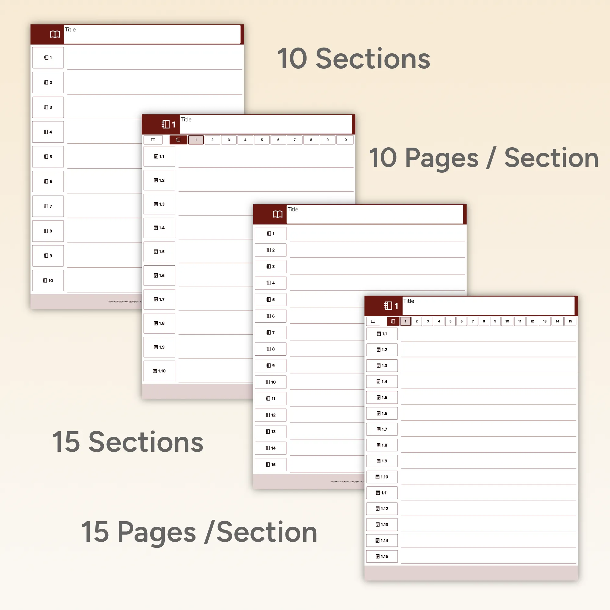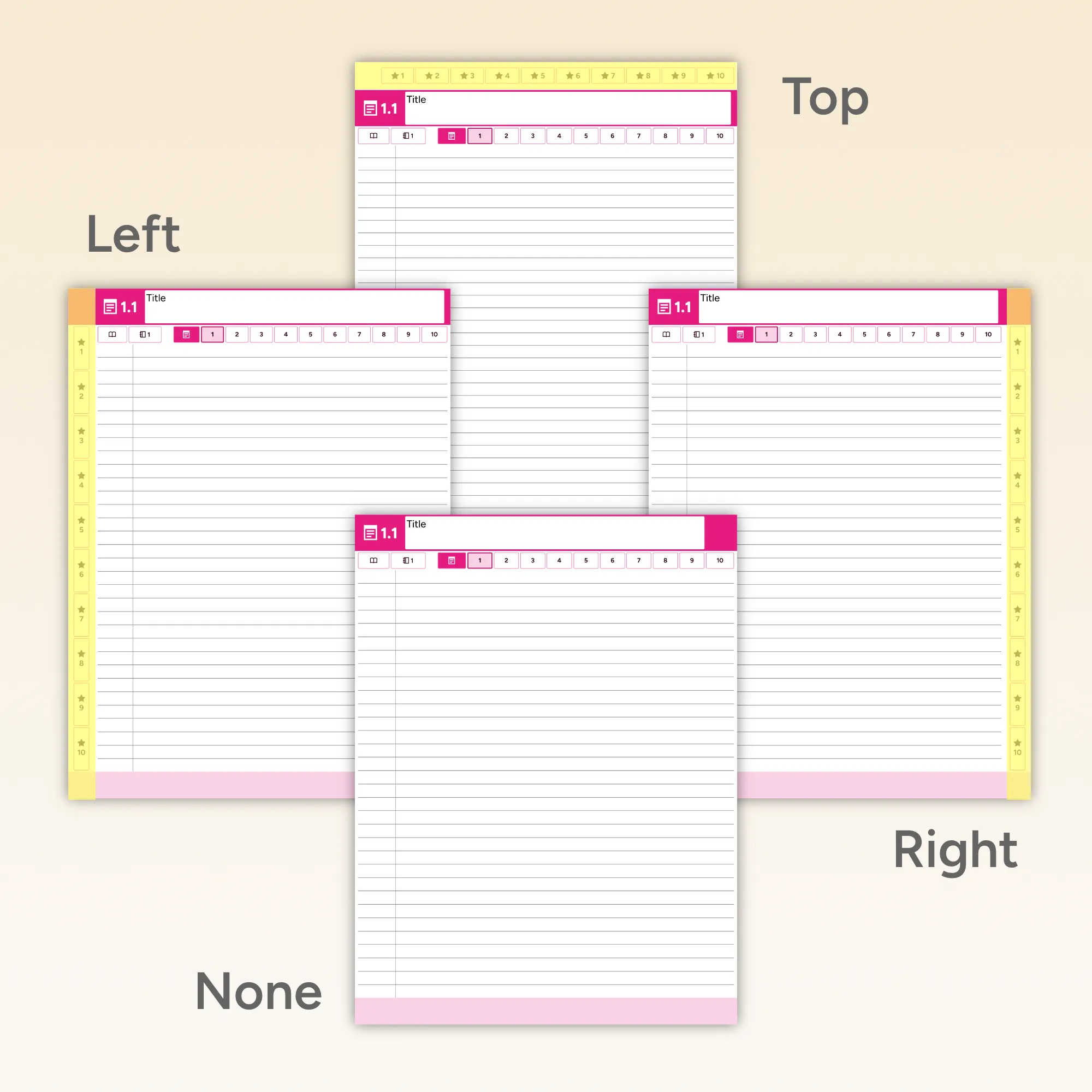 A collection of 960 PDF notebooks for the full-sized Paper Pro. 10 different theme colors. Includes fully-hyperlinked table of contents. Structured with sections, or unstructured with indexed pages. Right- and left-handed variations. Lined, grid, dotted, or blank pages. Space for your open toolbar.